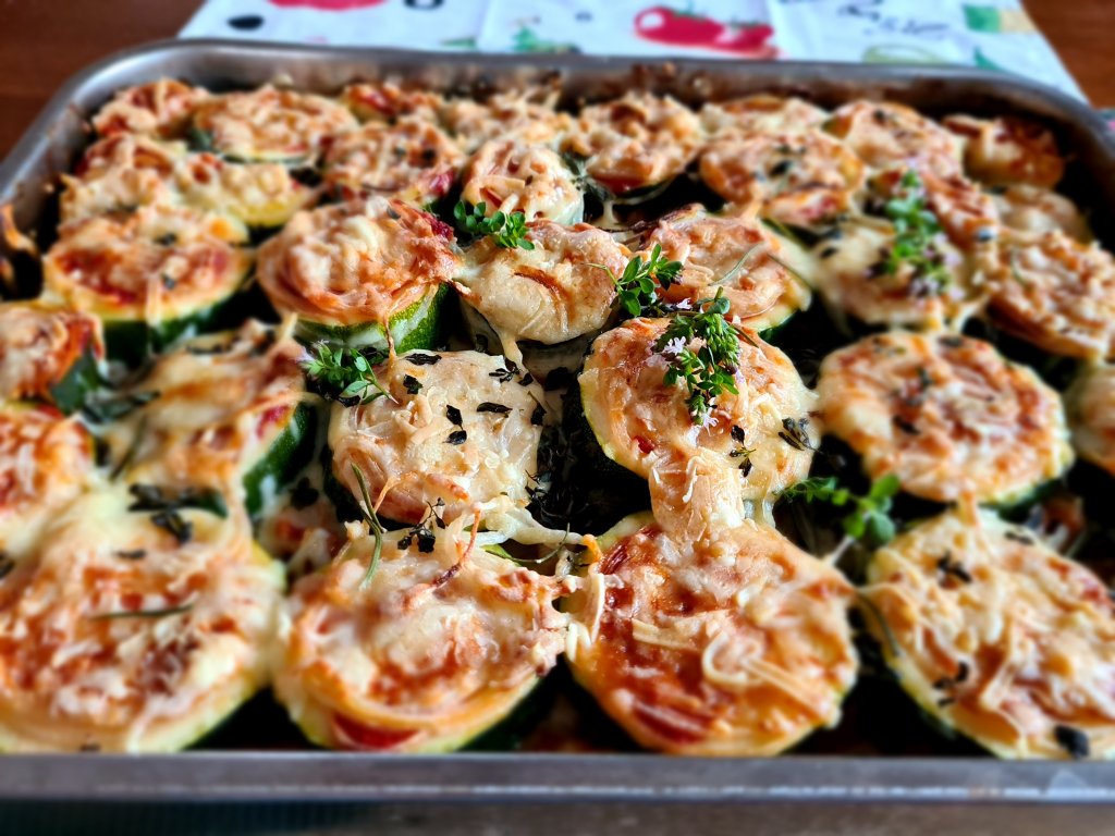 Nudeln vorgegart in würziger Tomatensoße in die Auflaufform geben und oben drauf Zuccini mit Salz bestreuen, Tomatenmark, Zwiebeln, mit Reibekäse bestreuen und bei 200 Grad ca. 25 min überbacken …