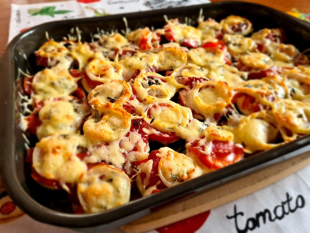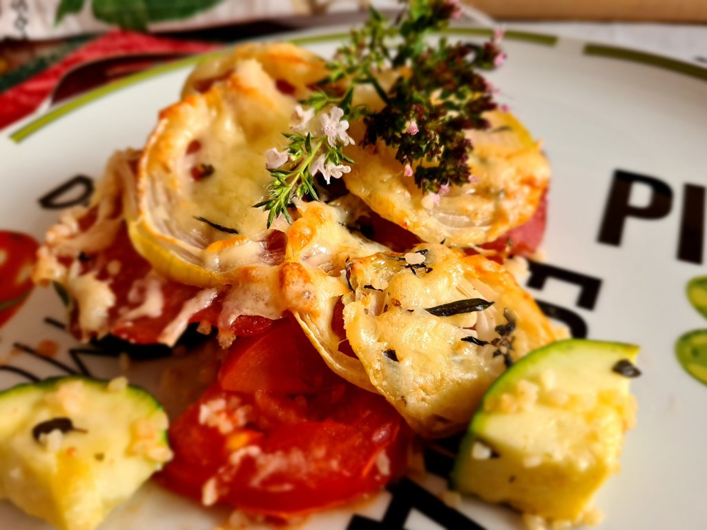 In der Auflaufform eine Unterlage aus 200 g Cous Cous, oder Bulgur (vorher mit heissem Wasser und Salz ital. Gewürzen etwas gutem Olivenöl etwa 10 min quellen lassen), frische Mediterrane Kräuter drüber, die Zucchini in ca. 1 cm Scheiben schneiden, salzen und bisschen Käse drauf, dann Tomaten, Salami, Zwiebelringe und frische Kräuter auf die Zucchini Schichten, mit Käse bestreuen und bei 220 Grad ca. 30 min überbacken.