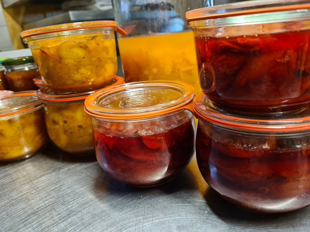 2 kg Zwetschgen entkernt, 1 Vanillezucker, 1 gestr. Teelöffel Lebkuchengewürz, 1 Teelöffel Zimt, 3 Teelöffel Tonkazucker (selbstgemachter), 200 g Rohzucker, 4 Esslöffel Rum, alles zusammen kurz aufkochen, dann heiß in Einmachgläser füllen, Einkochen 30 min bei 90 Grad. Das andere ist das gleiche mit Mirabellen, da nur 100 g Zucker nehmen und noch 180 ml Wasser dazu.
