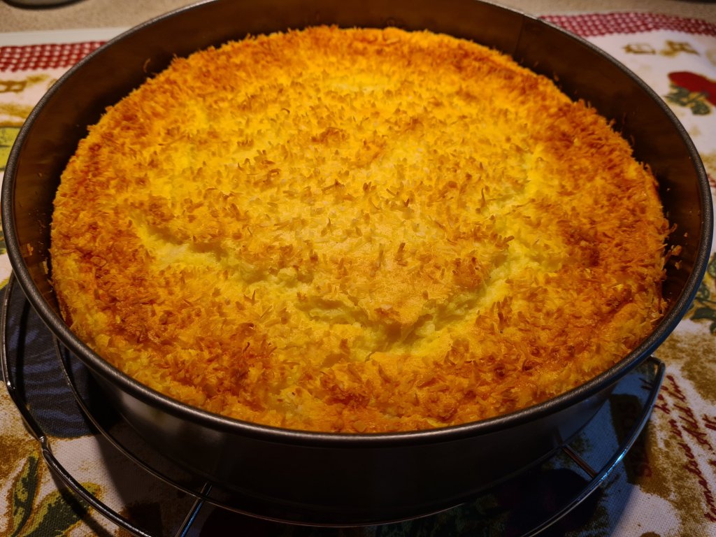Eine 3/4 Dose Ananas in Stückchen (gut abgetropft) vorsichtig mit einem Löffel unterheben, sofort in eine gebutterte mit Kokosflocken ausgestreute Form füllen, Springform oder Auflaufform, mit Kokosflocken bestreuen.