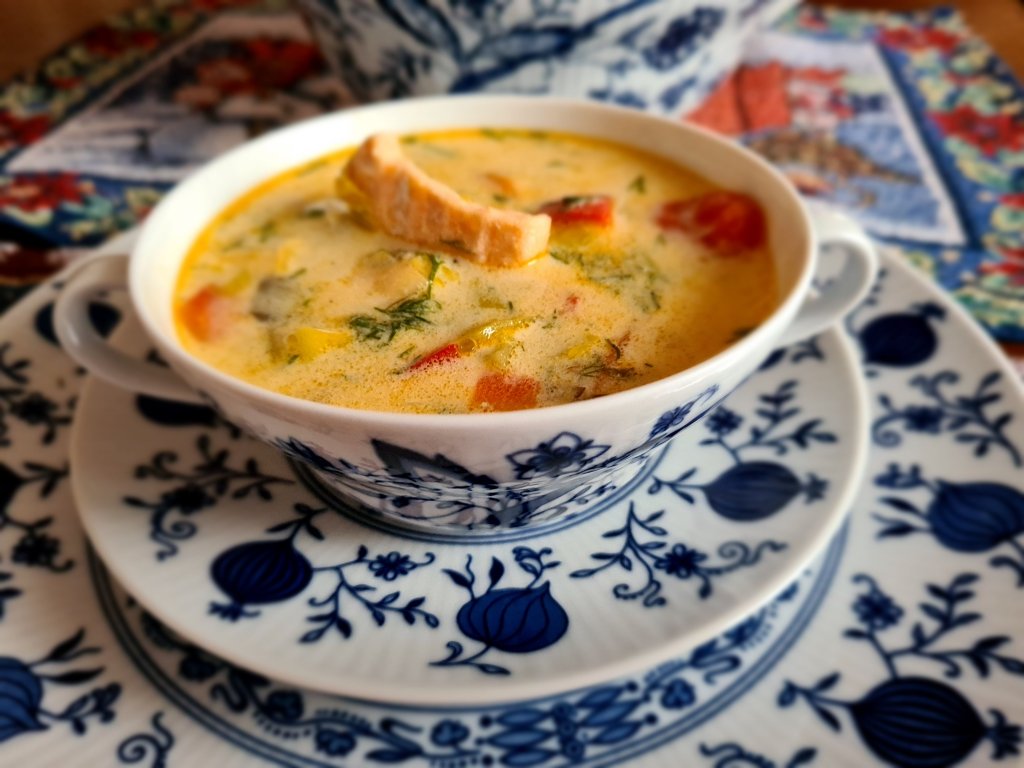 Den Lauch und Knoblauch in Butterschmalz andünsten, dann mit Weißwein ablöschen und bis auf die Hälfte Paprika, den Zitronenabrieb und den Fisch, alles zugeben, mit Wasser auffüllen, bis das Gemüse gut bedeckt ist und solange köcheln bis die Kartoffeln weich genug sind ca. 10- 15 min, nun den Fisch und den Paprika zugebeneinen kleinen Moment köcheln lassen, mit dem Zitronenabrieb, Zitronensaft und den anderen Gewürzen abschmecken, evtl. noch etwas Weißwein, dann noch einen Becher Creme Fraiche vorsichtig unterrühren. Wenn es exotisch sein soll anstatt Creme Fraiche, Kokosmilch nehmen und mit roter Currypaste abschmecken!