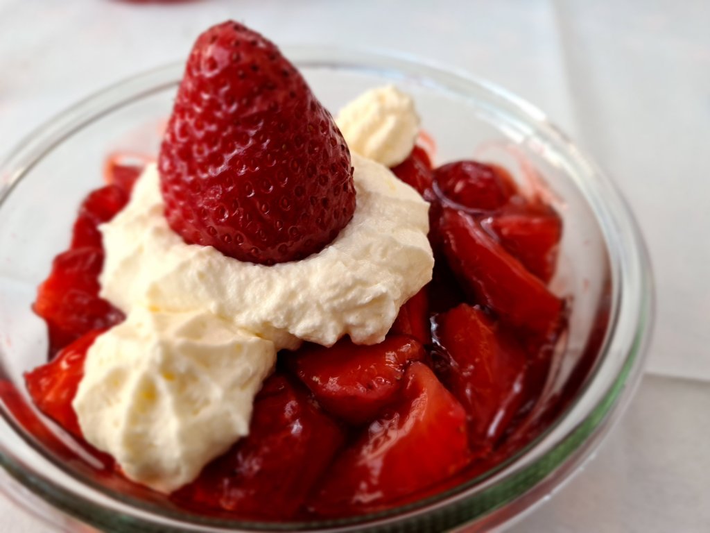 Klein geschnittene Erdbeeren drauf und einen Lukullus Tortenguss mit 300 ml rotem Fruchtsaft zubereiten, noch heiß darüber geben – abkühlen lassen – Deckel drauf und in den Kühlschrank stellen! Vor dem servieren mit gesüsster Schlagsahne dekorieren!