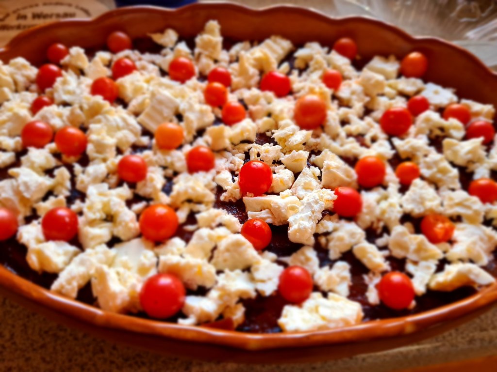 ca. 4 Rote Beete (400- 500 g) gegart in kleine Würfel, oder geraspelt unter die Tomatensoße mischen und nochmal abschmecken. Dann auf den Reis in die Form füllen und mit 1- 2 Packungen Schafkäse bestreuen.