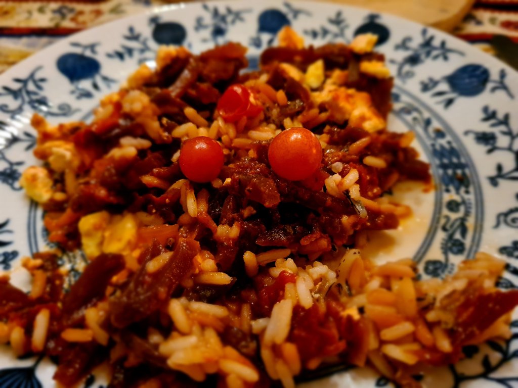 1 Tasse Reis ca. 150 – 200 ml mit der doppelten Menge Wasser, etwas Salz, ein Tropfen Öl mit geschlossenen Deckel mäßig kochen bis das Wasser vom Reis aufgenommen ist, dann in leicht geölte (ich habe Chilliöl genommen) Auflaufform geben.