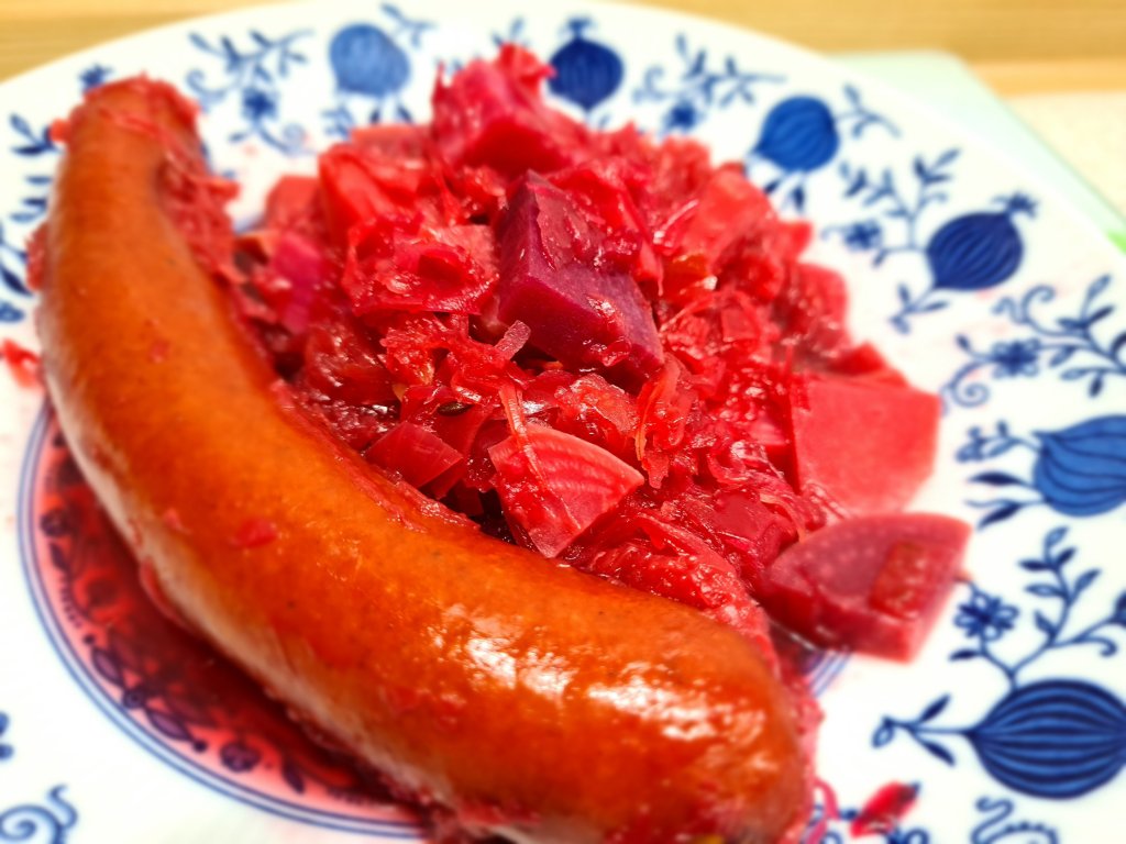 Das ganze nun ca 30 min köcheln, mit Salz und Pfeffer abschmecken…man kann gut Kassler mitgaren, oder Rindswurst passt auch dazu! Bei Roter Beete vorgegart erst zugeben, wenn die Kartoffeln weich sind!