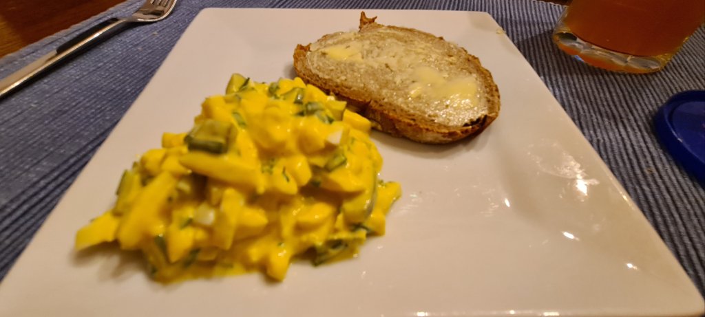 4 Gewürzgurken in kleine Stückchen schneiden. Nach belieben Schnittlauch und Petersilie,