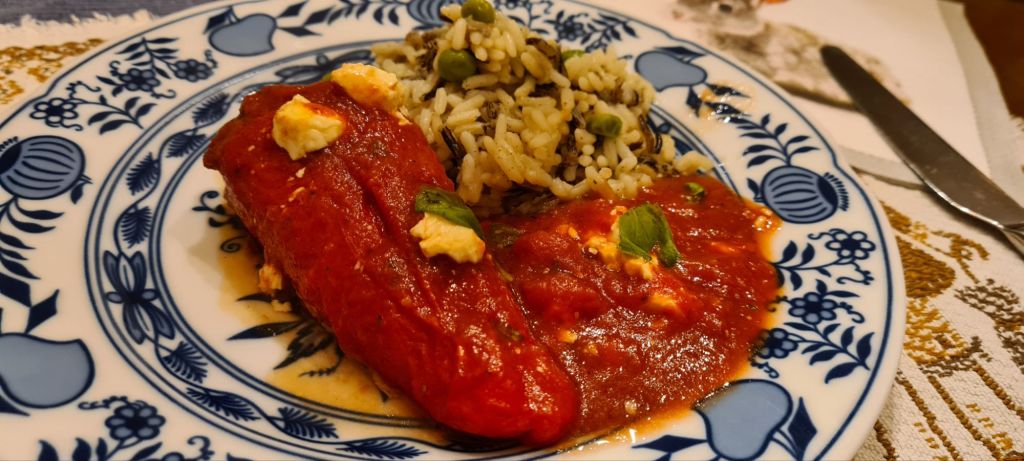 Alles mischen, abschmecken und über die vorgegarten Paprika gießen, den restl. Schafkäse drüber krümmeln, dann noch so lange garen bis die Soße anfängt Bläschen zu schlagen!