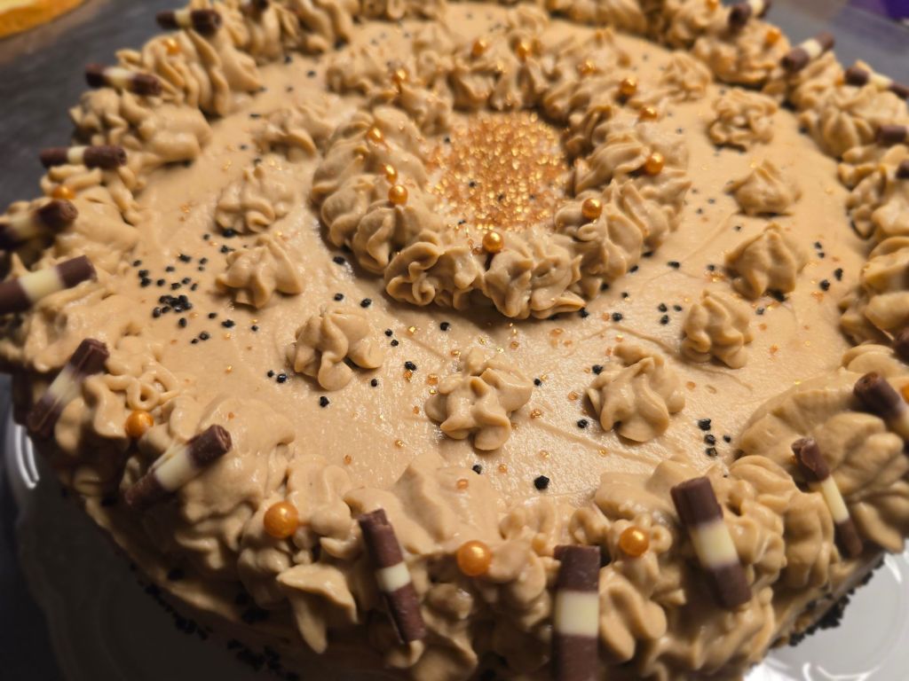Die Gelatine in dem Espresso nach Packungsanleitung auflösen und 2 min unter rühren abkühlen. Mindestens 6 Esslöffel von der Creme nach und nach unter rühren mit Schneebesen in die Gelatine geben. Dann wieder unter schnellem rühren mit dem Schneebesen die Gelatinemasse unter die Kaffeecreme rühren. Creme in den Kühlschrank stellen, wenn sie anfängt fest zu werden (1-2 Stunden), die Torte mit 2/3 der Creme füllen, der Rest ist für die Dekoration am nächsten Tag.