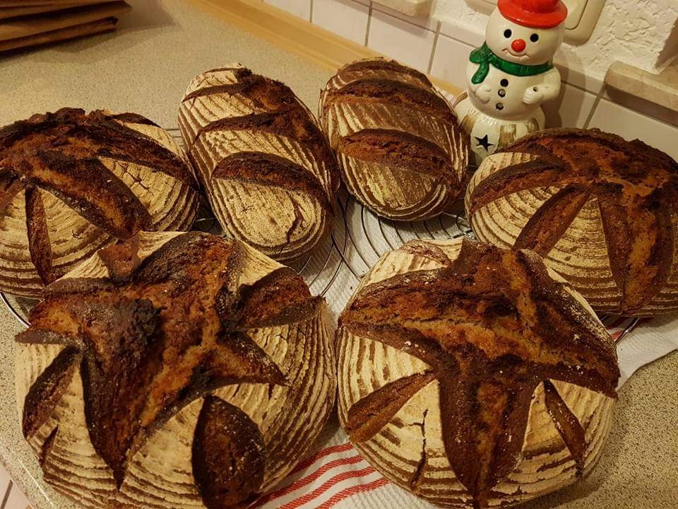 Dreikornlaibchen (Weizen- Dinkel- Emmer) Rezept für 2 Laibchen: 150 g Lievito Madre am Vortag aufgefrischt 300 g Weizenmehl 550 200 g Dinkelmehl 630 100 g Weizenvollkornmehl 250 g Emmervollkornmehl 3 g Hefe 1/2 Esslöffel Öl 1 Esslöffel Honig 22 g Salz Ca. 600 ml Wasser Aus allen Zutaten den Brotteig herstellen, in der ersten Stunde 2 x falten und abgedeckt über Nacht stehen lassen, ich hatte ca. 19 Grad im Raum. Am nächsten Tag die Laibe formen und nochmal gehen lassen, dann 15 min bei 250 Grad mit Dampf backen, abdampfen und weitere ca. 30 min bei 200 Grad backen… von Carmen Gehl September 2019 –