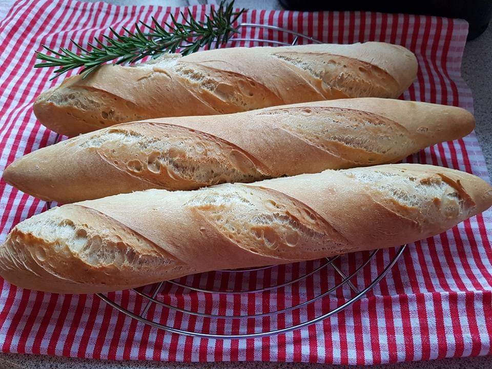 Dann Baguettes formen, ich habe immer ca. 300 g Stücke genommen, Restteig ist im Kühlschrank! Baguettes einschneiden und nochmal ca. 30 min gehen lassen, mit Dampf 10 min bei 250 Grad backen, dann abdampfen und ca. 10 min bei 200 Grad fertig backen!